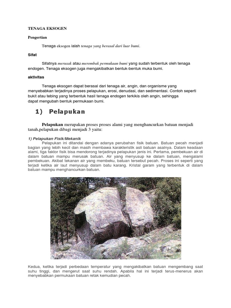Tenagaeksogendanendogen from img.dokumen.tips Sifat umum tenaga eksogen adalah merombak bentuk permukaan bumi hasil bentukan dari tenaga endogen. Atmosfer yang terdiri dari perubahan suhu dan angin menjadi sumber. Tenaga eksogen adalah salah satu dari 2 tenaga di bumi yang mempengaruhi bentuk permukaan bumi. Tenaga eksogen dapat berasal dari tenaga air, angin, dan organisme yang menyebabkan terjadinya proses pelapukan, erosi, denudasi, dan sedimentasi. Sebagai contoh adalah air, angin, organisme, sinar matahari, dan es. Nov 29, 2016 · seisme atau gempa bumi dapat terjadi akibat. Tenaga eksogen yaitu tenaga yang berasal dari luar bumi. Tenaga eksogen dapat berasal dari tenaga air, angin, dan organisme yang menyebabkan terjadinya proses pelapukan, erosi, denudasi, dan sedimentasi.